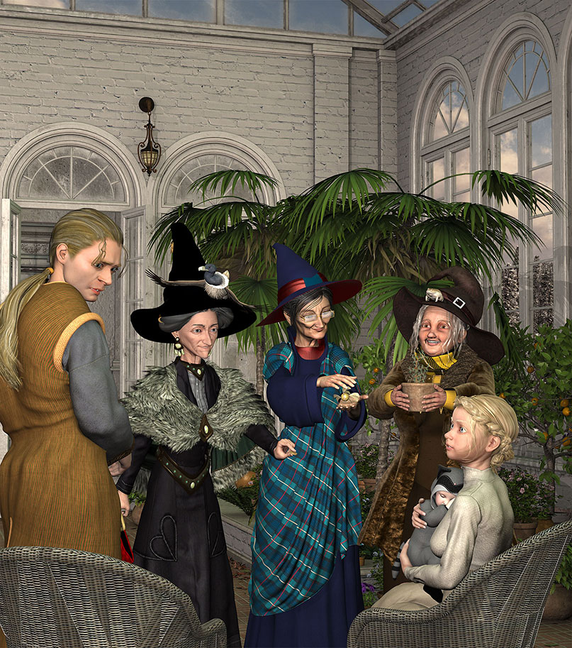 Three wise witches, bearing gifts. Definitely witches, and all of them wise, in their ways. I still rather think that they could be a little clearer on the concept of what constitutes an appropriate baby gift. (Did you already know that myrrh is a *thorny* plant? Not really something to have around a baby, regardless of how nice the sap may smell.)